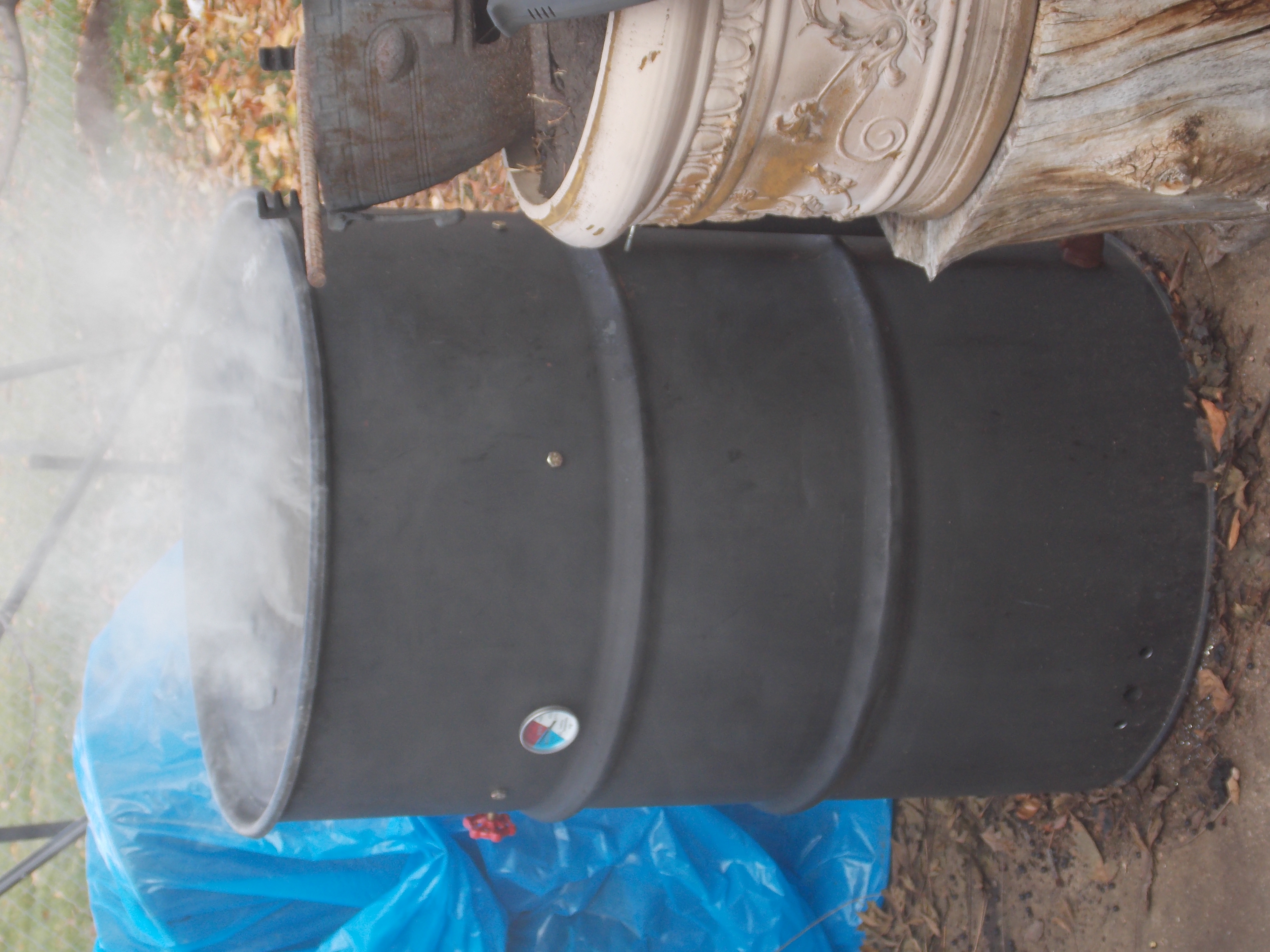 Finding a barrel was easy for us. We found a beekeeper in a little town about thirty minutes away who used food-grade barrels to store honey in and was selling the now-empty barrels for $15 each. We made the drive and bought our sticky drum. We used water and a brush to wash out the honey and then spray painted the outside with heat-resistant black paint.