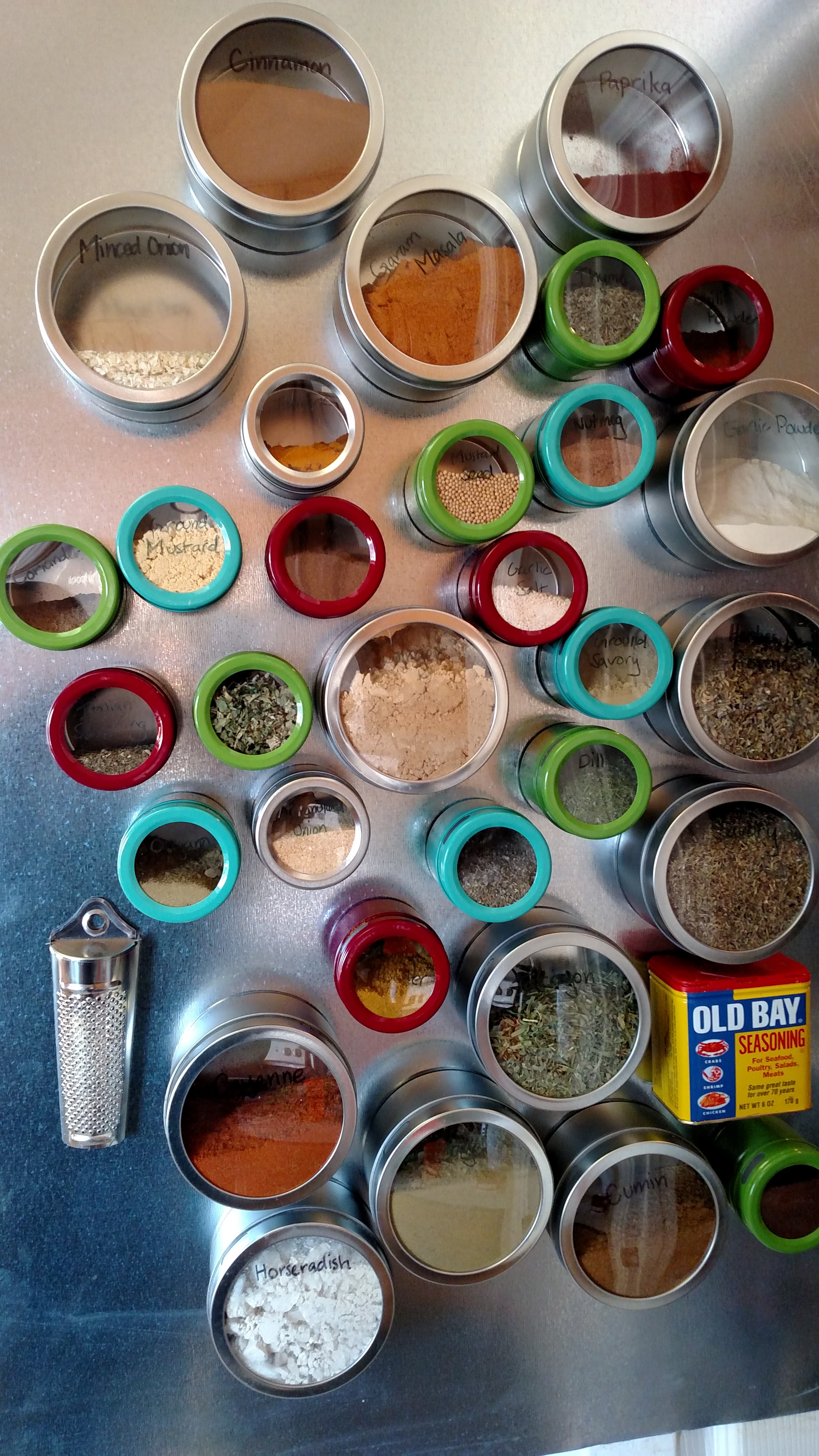 Good thing my husband is resourceful. When we saw some spice jars with clear lids, pour spouts, and magnetic bottoms at World Market, we bought out their inventory and got to work.