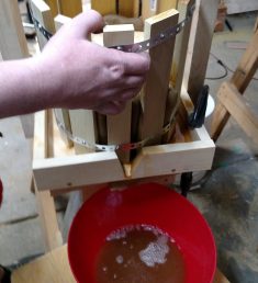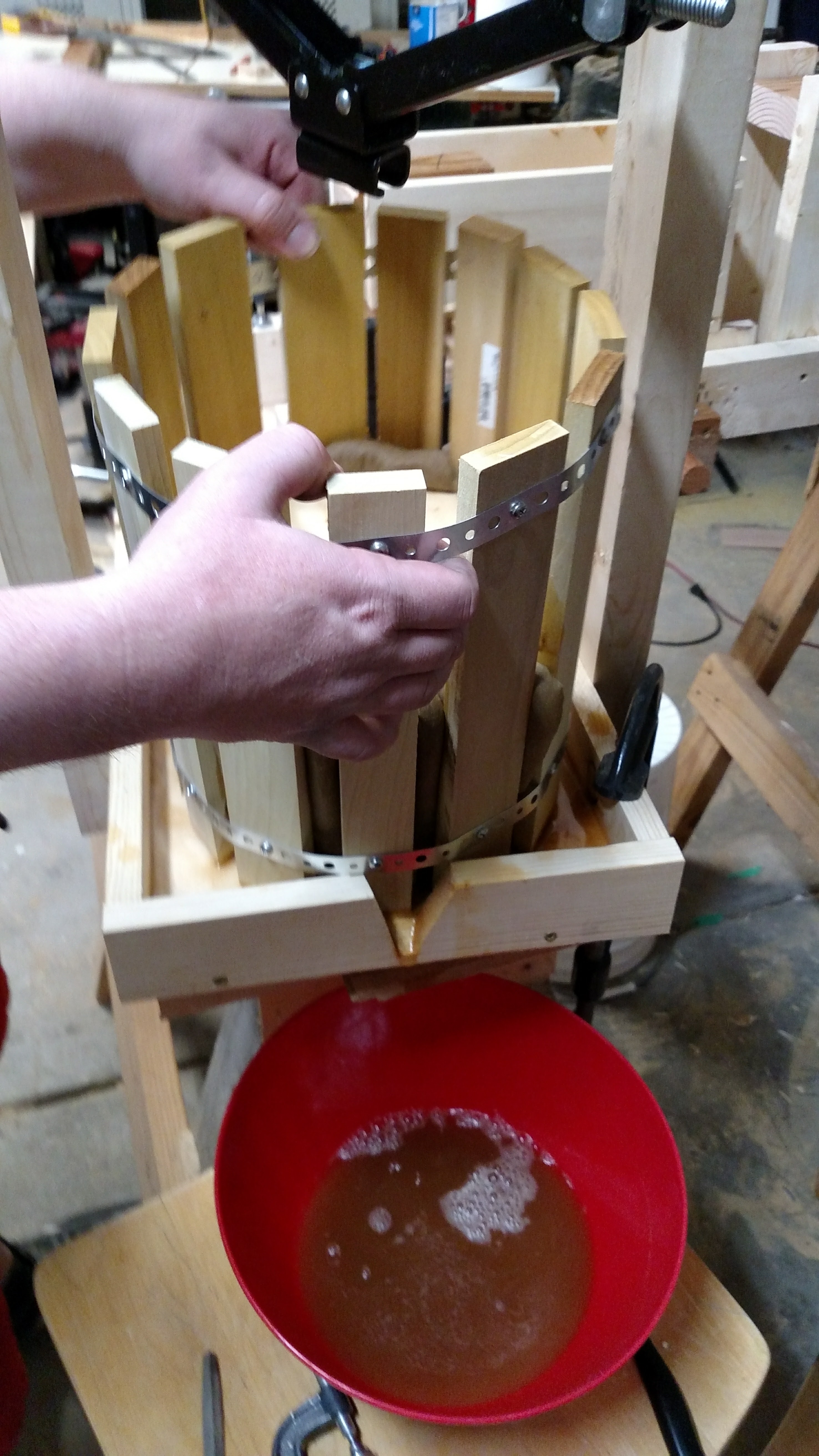 The grinder worked great with no modification, though after one day of grinding by hand Gordon decided attaching a motor was a better (and only slightly more dangerous) method. We were able to grind and press four large buckets of apples with a few nights’ work.
