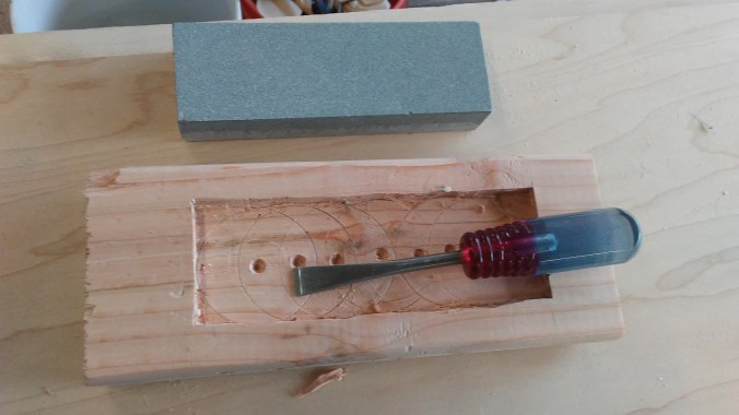 Paul doesn’t believe in throwing things away that might be useful, so he used a scrap piece of 2×4 to chisel a case for his stone. Because chiseling the entire things takes a whole lot of time, Gordon drilled out the space for his stone first. So if the upcycling mood strikes and you have a sharpening stone, do this: