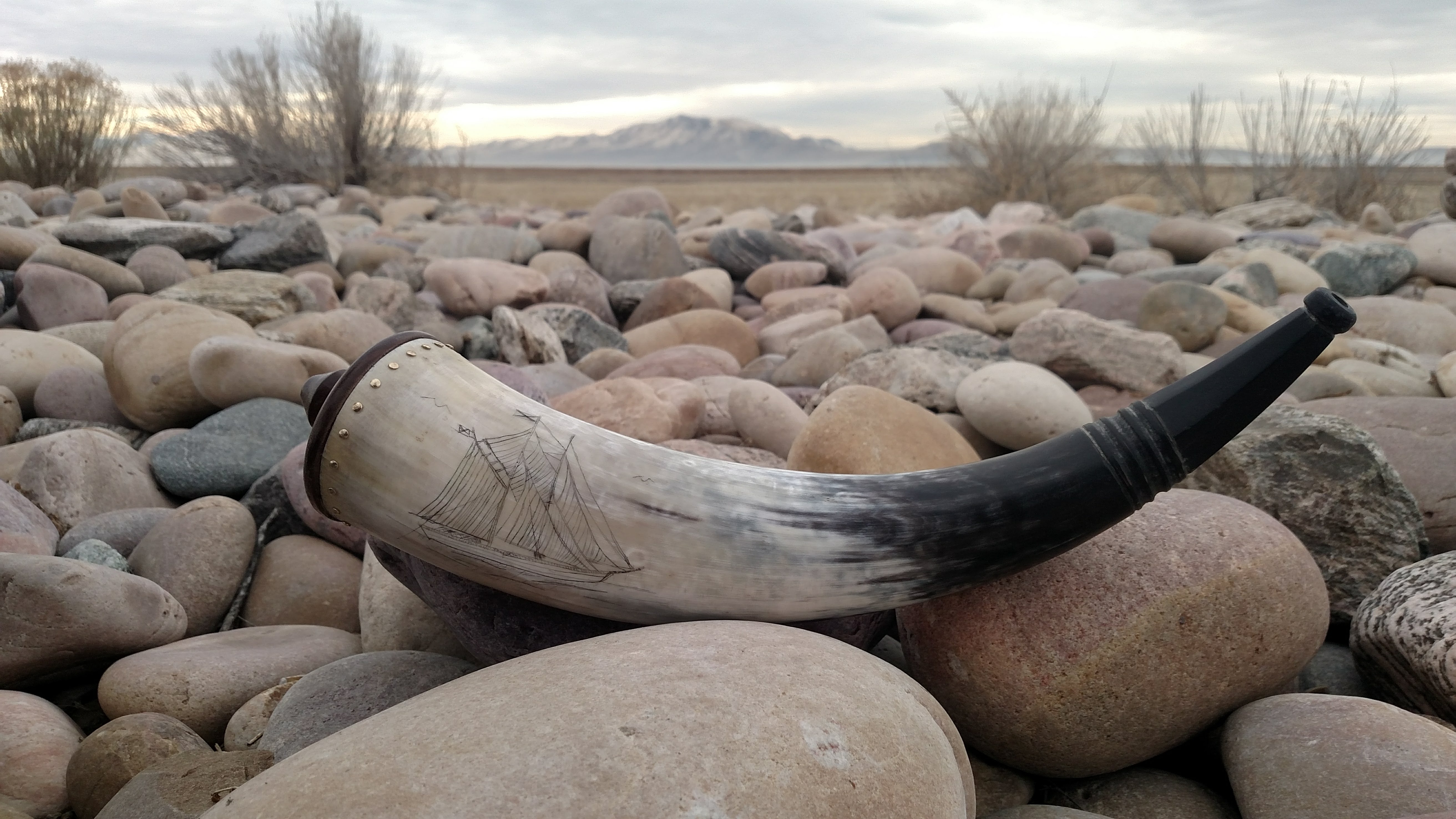 Ideally, I would have a picture of the finished powder horn in Nova Scotia, with the “briny ocean” and “dark and dreary” mountains in the background. But we live in Utah, so I took it to the Great Salt Lake with Antelope Island in the background. It’s basically the same.