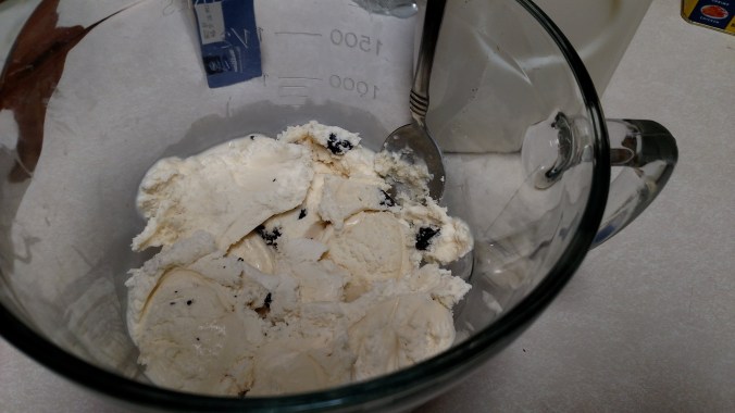 Combine the ice cream and milk and stir to soften. We used Tillamook “Malted Moo Shake,” which is Gordon’s favorite ice cream ever. Also, malt makes it seems more appropriate for the fifties somehow. Of course, as Johnny says, “you can use any flavor you go for.”