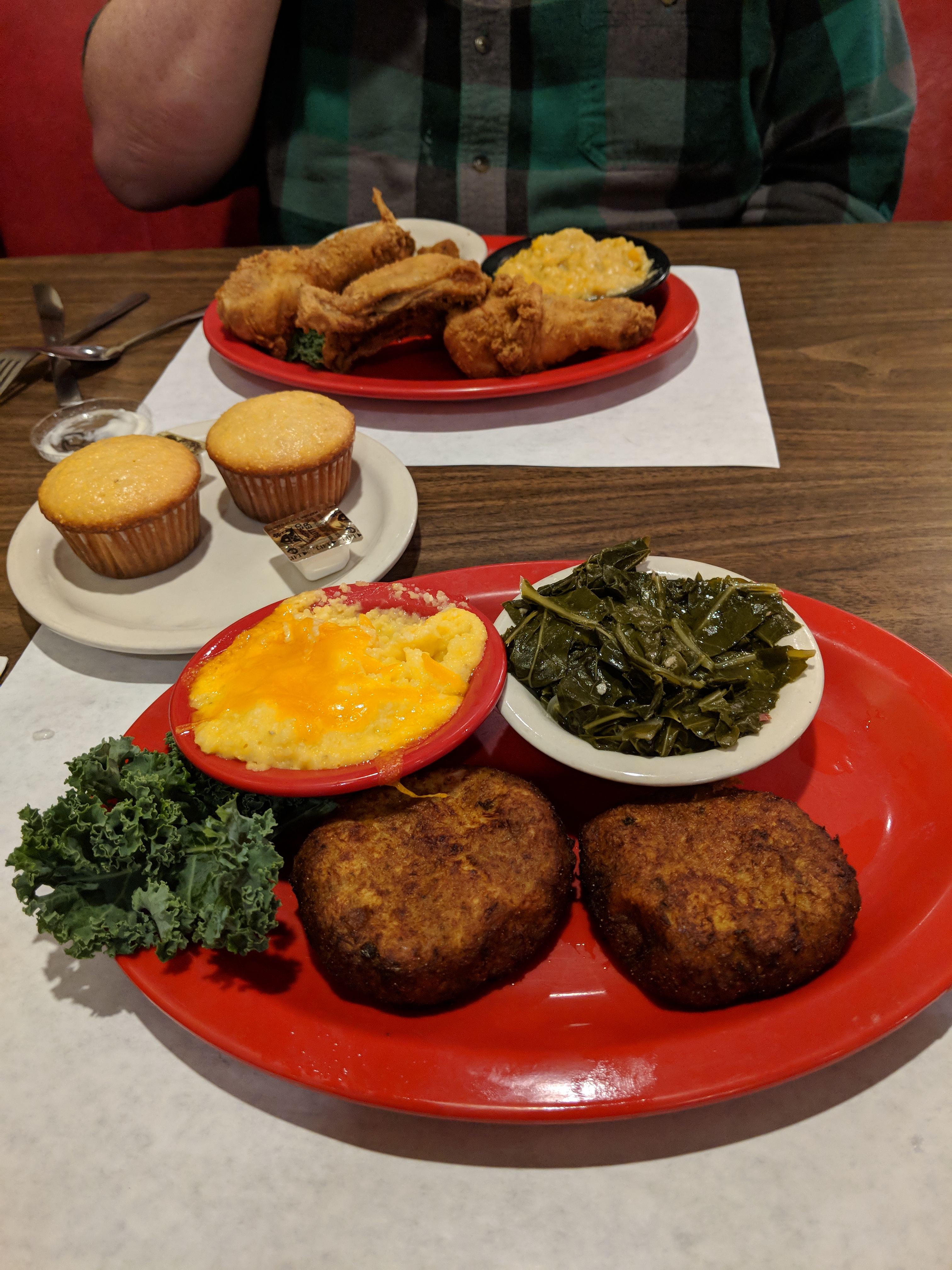 If you are looking for some delicious Southern comfort food, Corey’s Country Kitchen is the way to go. We had fried chicken, okra, corn pudding, grits, collard greens, corn muffins, and crab cakes, and it was all really delicious.