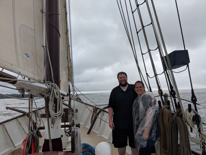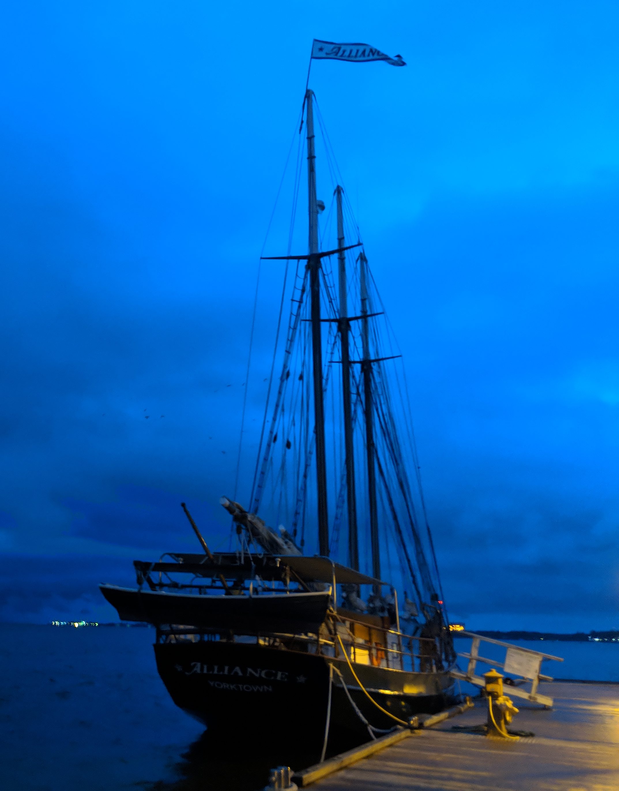 We booked a two-hour sunset cruise on the Yorktown Schooner Alliance partly because I love sailing (thank you, years working at Boy Scout camp) and partly because Gordon’s dad has always wanted to hoist sails and play crew. It looked like our trip might end up cancelled due to rain, but with a break in the post-Hurricane Florence squall, the crew decided to chance it. We did get pretty soaked at the beginning, but the rest of the trip was overcast, cool, and beautiful.