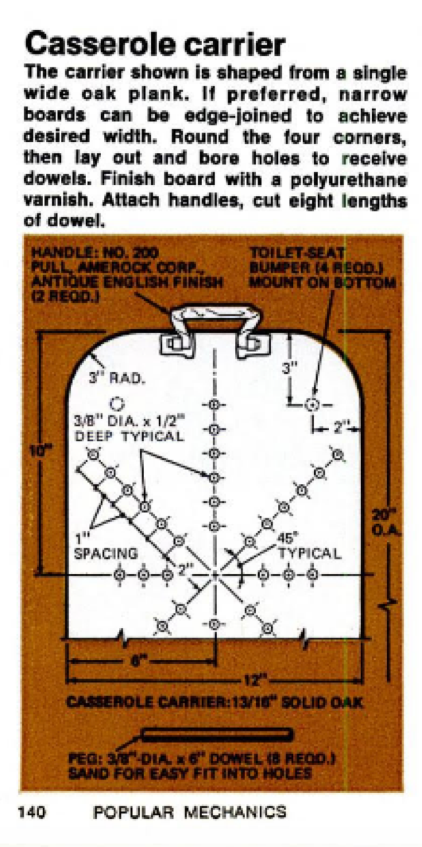 The carrier itself is really simple to build. You really just need a board big enough to fit your casserole dish (or enough wood glue to make a board big enough), a compass and scroll saw to round the edges, a drill press, sandpaper, stain, varnish, hardware and rubber feet (because it turns out, hardware stores don’t sell toilet seat feet except attached to actual toilet seats, and you don’t really want toilet parts anywhere near your food anyway).