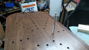 5. Mark and drill holes spaced evenly along the lines (according to the instructions). Make them the size of whatever dowels (or in our case, aluminum rod) you’ll be using for posts.These holes do not go all the way through the board. Don’t get carried away. Also drill holes for your handles.