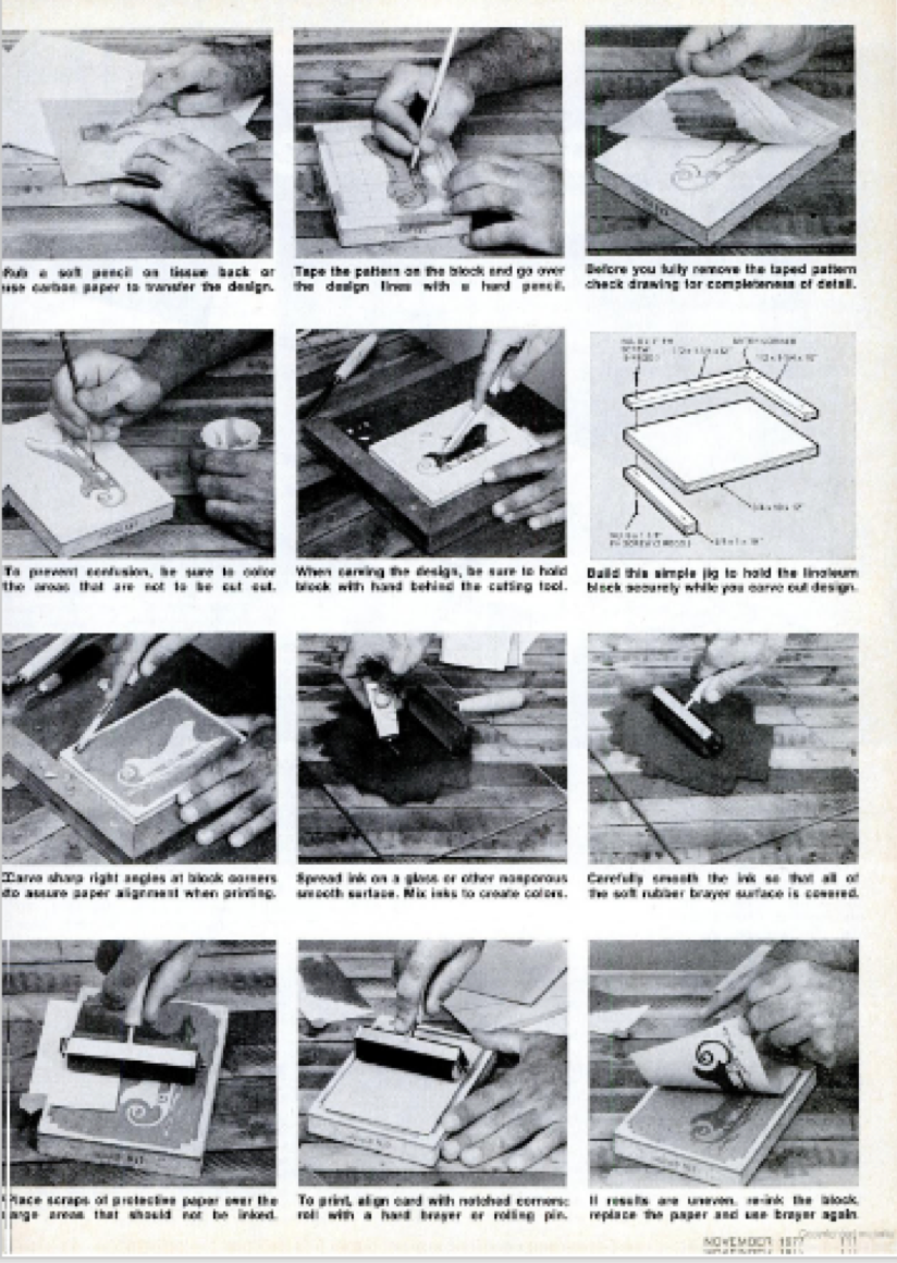 Lino Printing becomes much less intimidating when you realize that by “lino” they just mean linoleum that you gouge chunks out of to make a large stamp. The instructions for this process were surprisingly thorough in Popular Mechanics, taking up several pages.