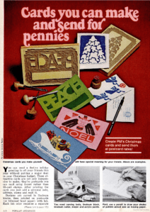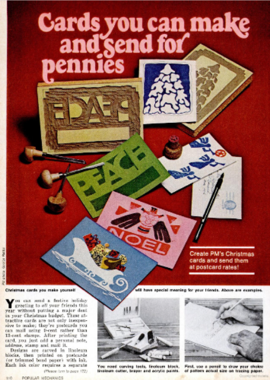 In this case, that meant finding a 40-year-old Popular Mechanics article about lino printing your own Christmas cards, buying a kit from Hobby Lobby, and making postcards.