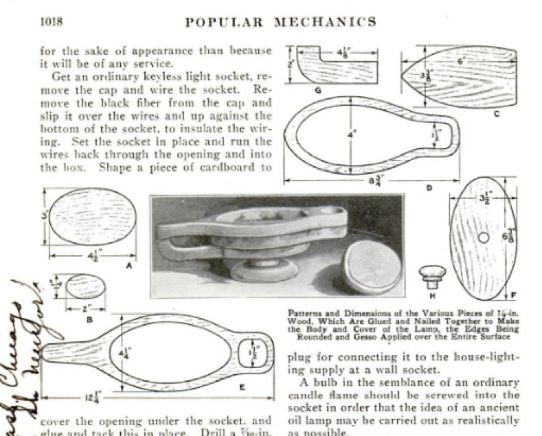 I don’t know about you, but when I read something like “One of the most interesting novelties that the home craftsman can make in his leisure moments is an electric ‘Aladdin’s lamp,'” I feel obligated to make a lamp. This is one of the earliest Popular Mechanics projects we’ve done so far, coming in from the June 1926 issue. Even if you don’t have a mantle to put it on (as the article suggests) it makes a great nightlight, especially for kids who dream of being a princess/genie/street urchin.