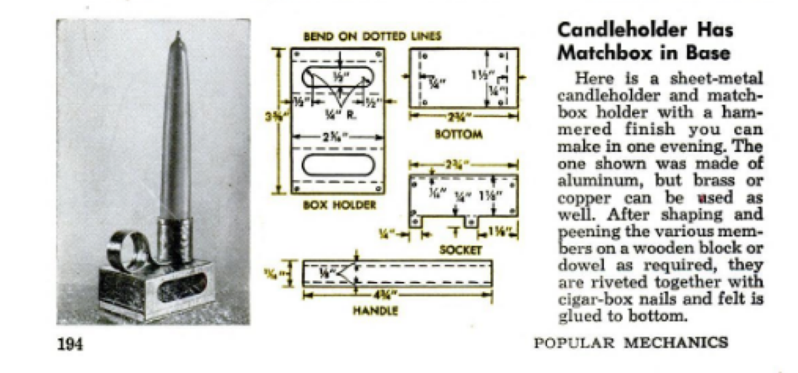 Good news, Popular Mechanics October 1957 (pg. 194) has the answer. This simple candleholder has a slot for a matchbox in the bottom so you’ll always have them both together, and the handle makes it easily portable. Unfortunately, if what I heard from the garage while Gordon made it is any indication, you may end up just getting the profanity out of the way before the power outage. But once it’s made, as long as you don’t lose it or bury it beneath other things, all frustration is gone by the time you actually need it.