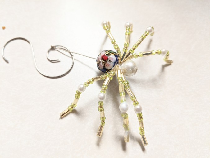 I made our pavuchky out of wire and beads. I started with large beads for the body and head, then wrapped wire between them and added small beads for the legs. The wire makes it easy to pose the legs and a little extra wire out of the back of the body makes it looks like the pavuchok is spinning a web on the tree. I used superglue to hold everything in place and secure the beads to the end of the wire. You can wait for the superglue to dry on its own, but I prefer to use an accelerator because I’m impatient.