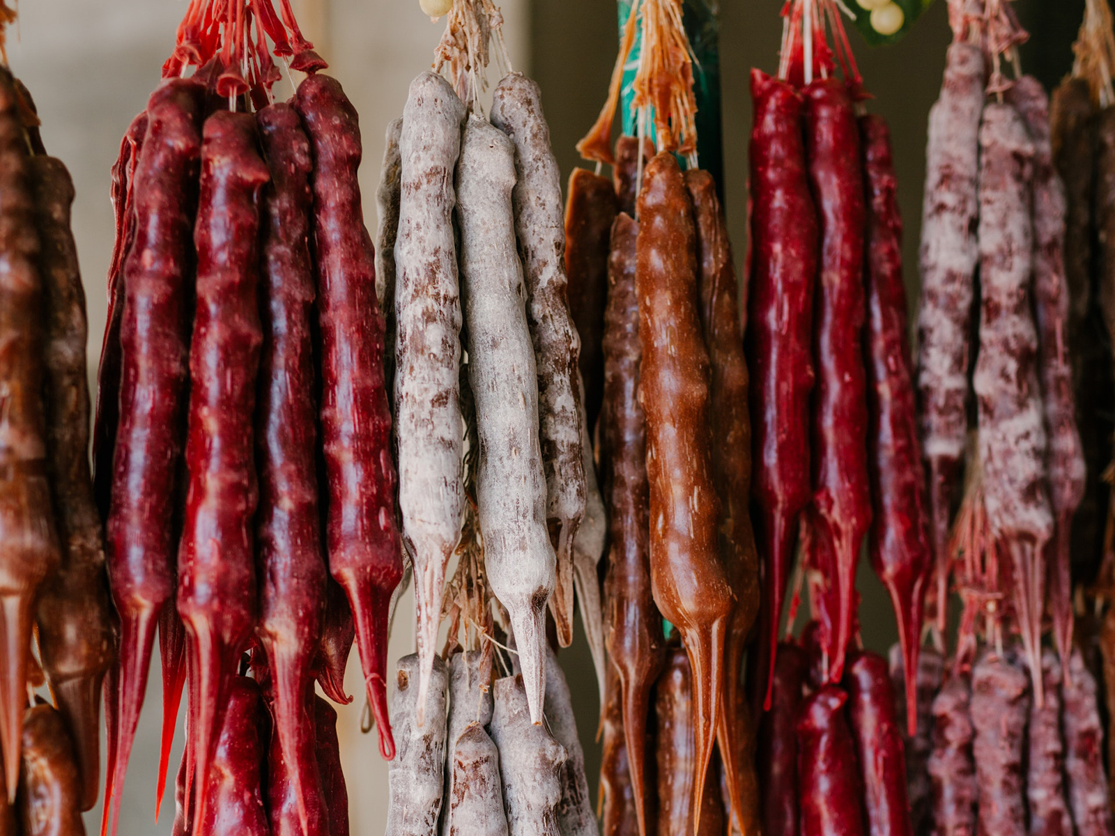 The traditional recipe has you lightly roast walnuts (other nuts or dried fruits are also an option) and then thread them on a string. You create the coating by reducing grape juice by half, then mixing it with flour and sugar and heating it to make a smooth paste. Dip the string of walnuts like you would a candle, making sure the nuts are entirely coated. You then leave the string to air dry for 3-4 days, then repeat the coating process. Repeat the waiting and dipping at least one more time, but more if you like a thicker fruity layer. Prepared this way, churchkhela can be stored for months, making them a great treat to make during harvest and eat for Christmas and New Year. When you’re ready to eat your churchkhela, just pull out the string and cut the treat into pieces.