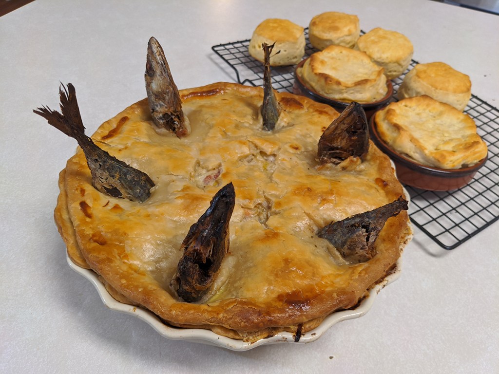 Because the spectacle of fish sticking out is really the important element, it doesn’t really matter what kind of filling you make for your pie. A hearty stew with potatoes, fish (seven kinds, if you’re feeling very traditional), cream and herbs worked great for us. The most important ingredient is pilchards (sardines) or similar small fish poked through the top before baking.