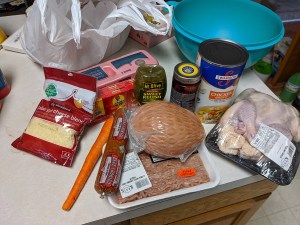 My first introduction to the ingredients for rellenong manok was a photo of our counter Gordon sent me after seeing the recipe online and immediately going out to buy everything he needed to make it. Specific ingredients vary between recipes, but common options include chorizo, ham, cheese, carrots, olives, raisins, pickle relish and hardboiled eggs.