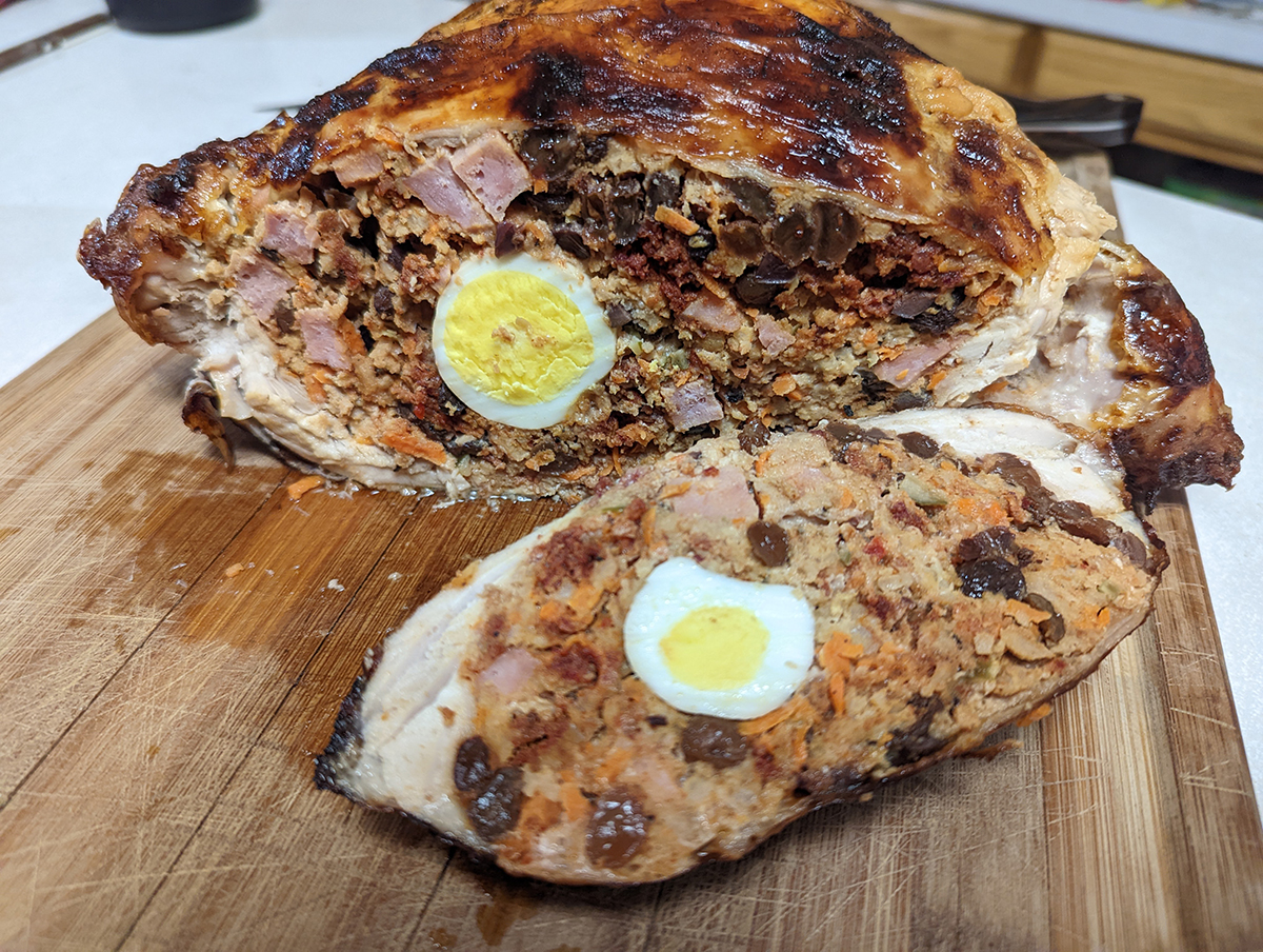 We quickly realized why this dish is saved for a special occasion. Deboning a chicken while leaving the skin intact, boiling eggs, making the filling, stuffing the bird back to the shape it was in before deboning, finding the perfect egg placement, sewing the bird closed, marinating, and roasting to a golden brown is definitely a labor of love.