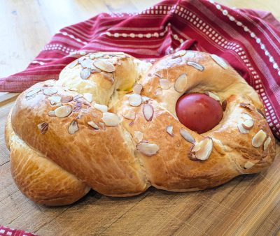Tsoureki is used to break the Lenten fast, when Orthodox faithful give up meat, dairy, fish, eggs, and wine. This sweet, brioche-like enriched bread is made with flour, milk, butter, eggs, sugar, and often citrus zest, cherry pit spice, and mastic resin. Some regions decorate the bread with nuts and sugar, and many bake red-dyed eggs into the dough to represent the blood of Christ. The bread rises around the eggs just as Christ rose from the tomb after His resurrection.